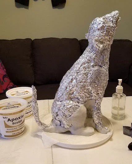 I formed the armature with wire and foil, then coated her with Apoxy sculpting clay, using a comb to create fur and painted her with white acrylic.