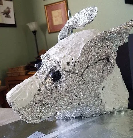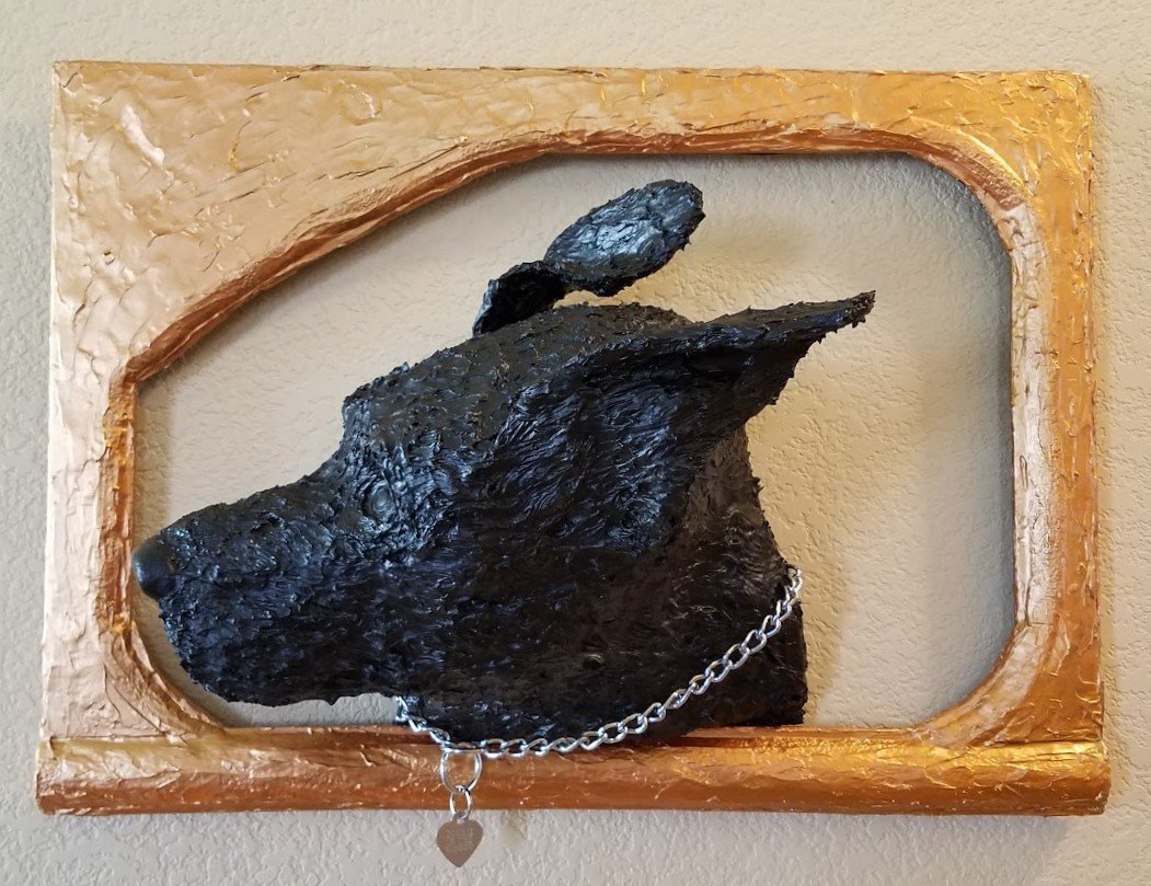 I shaped Sasha’s head, neck and ears with wire covered with foil, then a layer of extra heavy gesso. I applied more gesso with a palette knife to create her fur. I made her nose and eyes of Apoxy sculpting clay, then painted her with acrylic. I fashioned the car window frame of wood and foam core covered in gesso and acrylic paint.