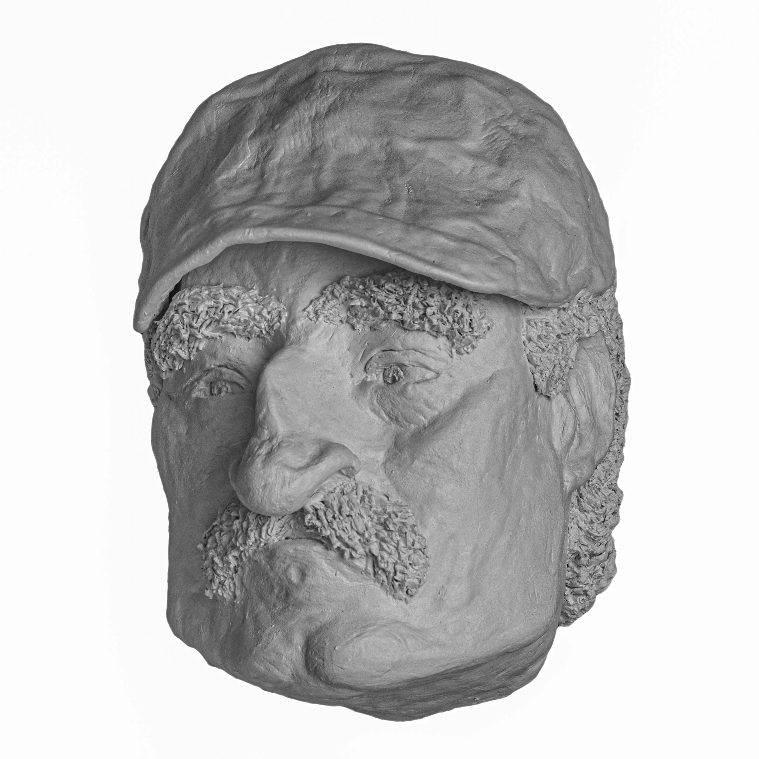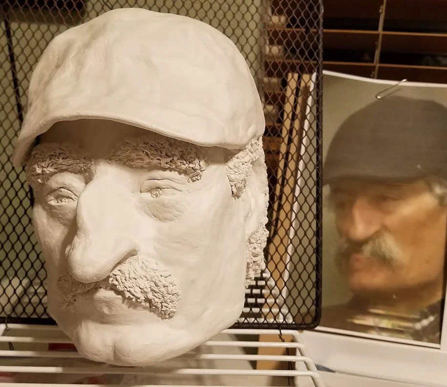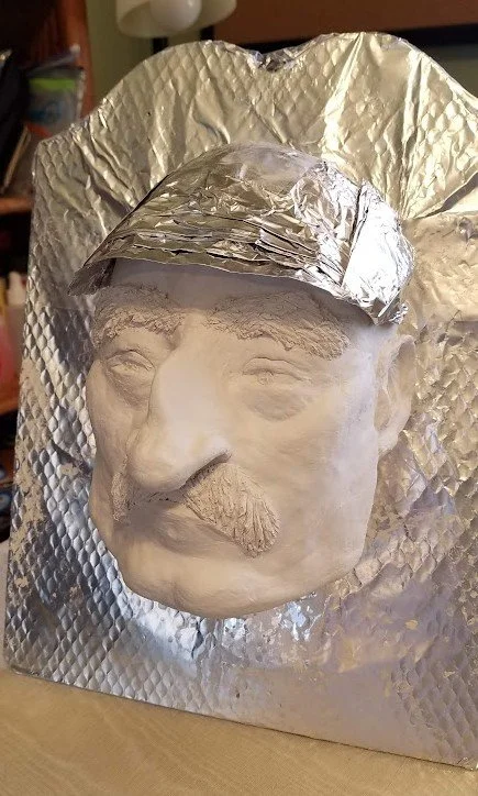 I covered a plastic mask with foil and wire mesh, then built his features and hat with Das Italian Modeling Clay.