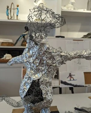 Wire, foil, super heavy gesso, Apoxie Sculpt, acrylic paint, polycrylic. Snow Dog is wearing snowboard goggles, in red, her favorite color, a collar and tag. She is riding a plastic snowboard.