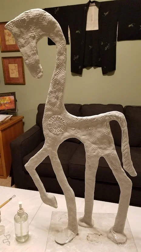 Using a small bronze sculpture that we bought in Rome as a reference, I calculated the proportions of a 34” armature of wire and acrylic sheeting, then covered it in Apoxy sculpting clay. I textured the clay by pressing in mesh fabric and painted it with house paint. I gave it a metallic bronze appearance with Art Alchemy beeswax paste.