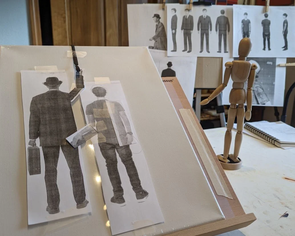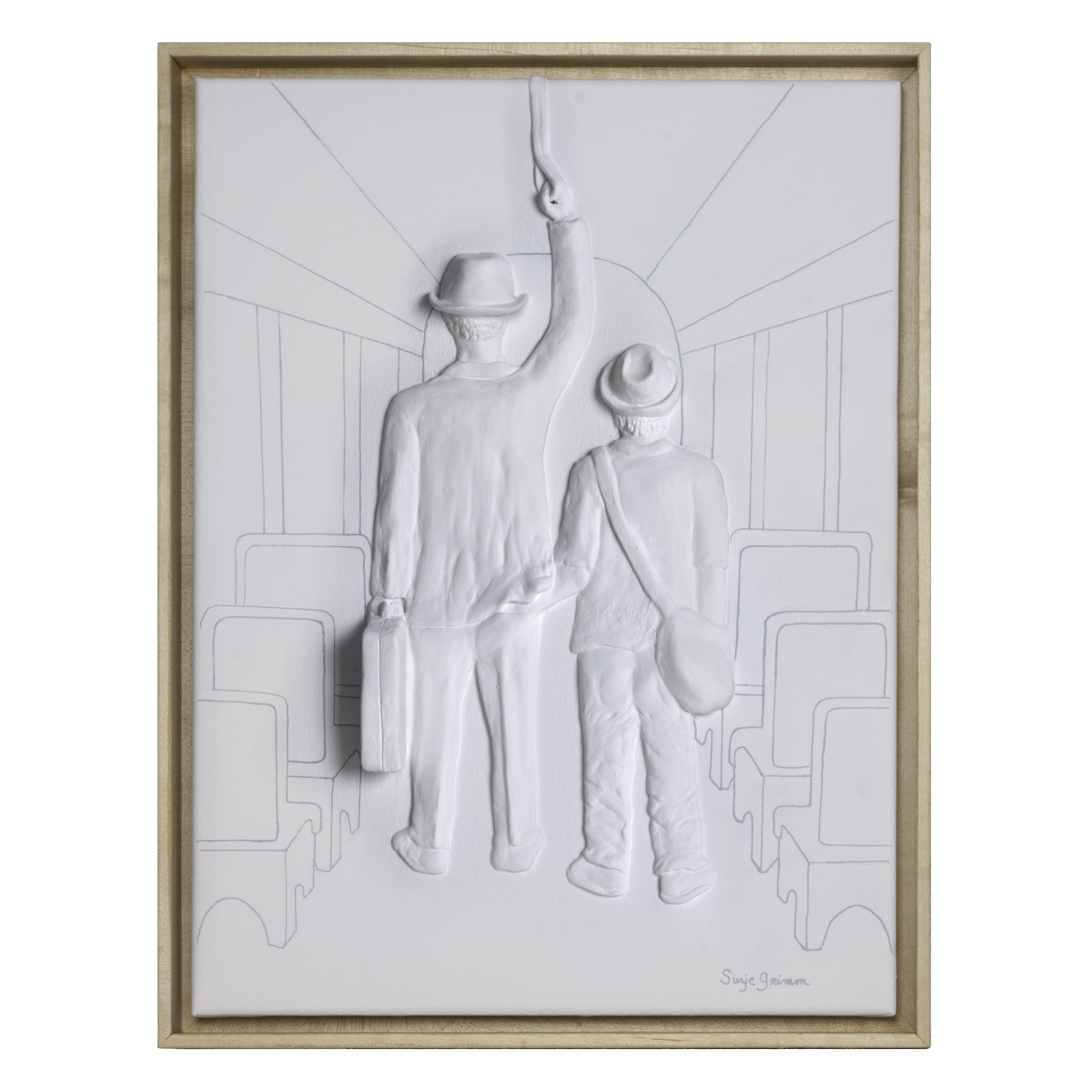 Using Apoxy sculpting clay, I built the two figures on a stretched canvas, then painted the canvas and figures with acrylic paint. I drew the seats and windows with an acrylic pen. The piece is mounted in a hardwood floating canvas frame.